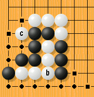 The inversion rule finds that the white stone c in figure 22 is a 2-surrounding block, and since the white stone c has two quasi-liberties only (and hence q < n m + 3 = 2 2 + 3 = 3), these quasi-liberties are added to the R*-zone. Therefore, the killing l3-move a is generated by means of a relatively cheap l2-search, so the question Anders Kierulf poses seems to be answerable in the context of the l-search methodology.