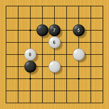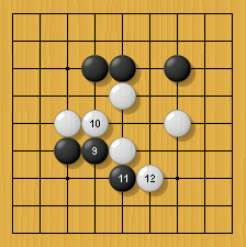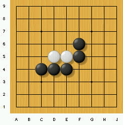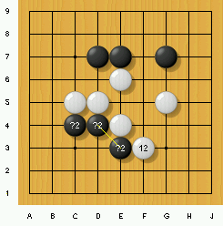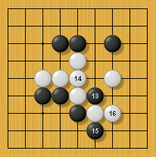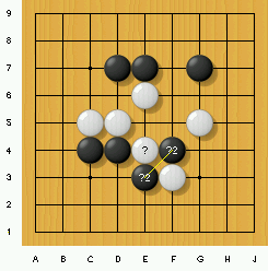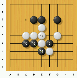 (n=2) Above figure: White move #14 at E5. After White connects at E5, the double-threat tesuji involving the two black blocks at E3 and C4 is reactivated. In addition, Black F4 can now be captured directly (as a single-threat tesuji, starting for instance with White G4).