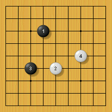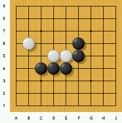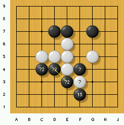 (n=2) Above figure: Black move #15 at F2. This move threatens the white stone at F3, whereas the black stones at E3 and C4 are still vulnerable. The only way to capture black F4 is now for white to play G3 (which is what happens below).